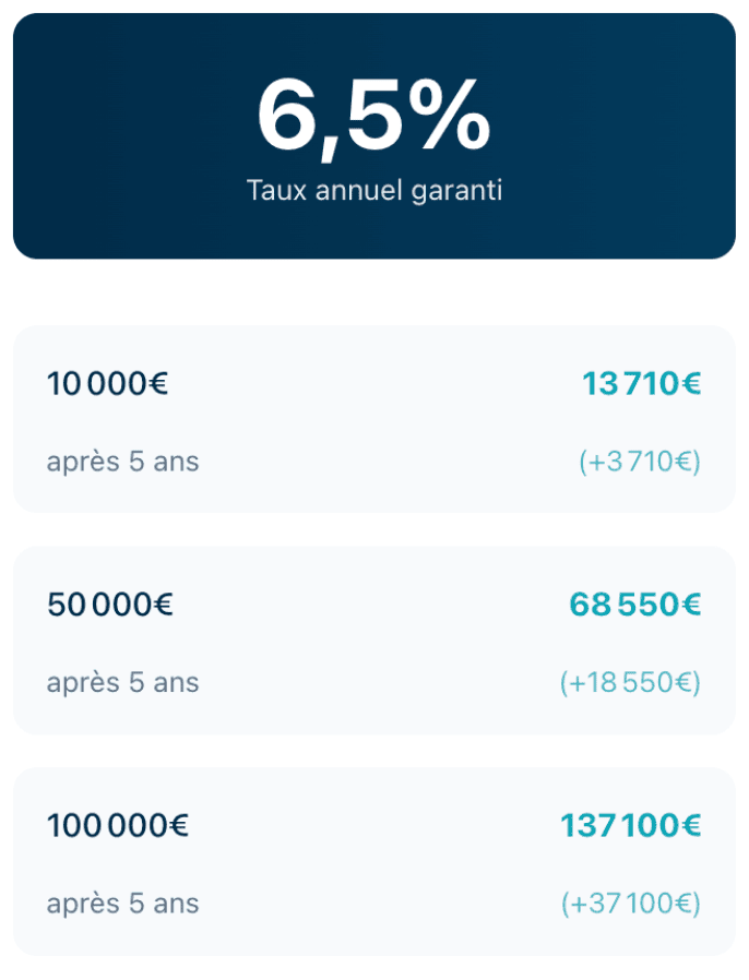 • Un taux fixe de 6,5% sur 5 ans : votre argent travaille enfin efficacement pour vous.